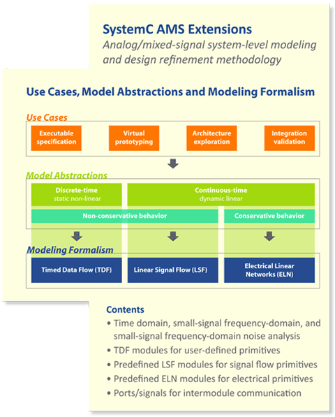 The SystemC AMS extensions define the essential modeling formalisms required to support AMS behavioral modeling at different levels of abstraction, consistent with the design refinement methodology. Established modeling formalisms are being standardized, introducing Timed Data Flow (TDF), Linear Signal Flow (LSF) and Electrical Linear Networks (ELN) modeling styles, which can be used in combination with SystemC descriptions.